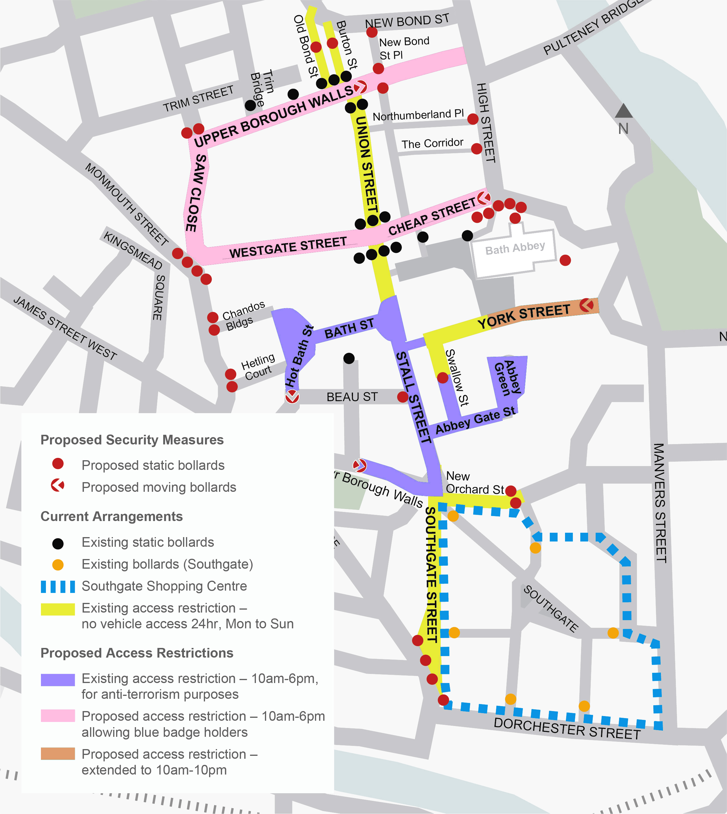**Blue Badge holders, carers and taxis transporting Blue Badge holders will be permitted with controlled, authorised access in Cheap Street, Westgate Street, Saw Close, Parsonage Lane and Upper Borough Walls.