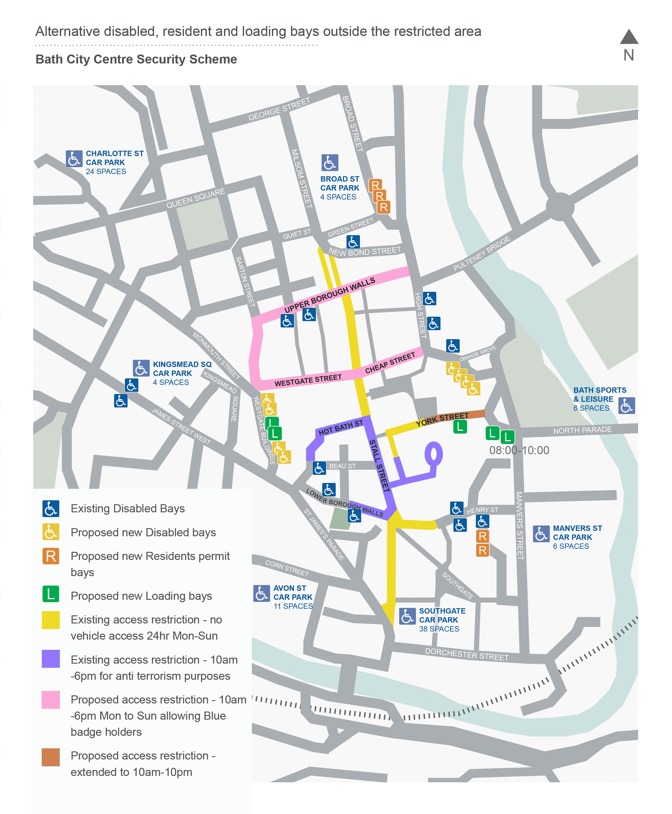 Friends, relatives or taxis, if carrying a Blue Badge holder as a passenger, can pick up or drop off at any time on Cheap Street, Westgate Street, Saw Close and Upper Borough Walls. They cannot use other streets in the restricted zone during the operating hours.