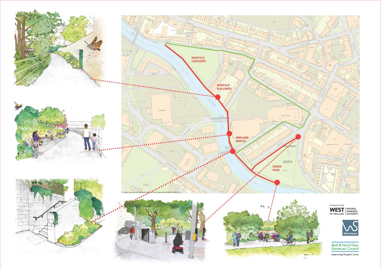 The Bath River Line is an urban green and blue infrastructure project grant funded by the West of England Mayoral Combined Authority (WECA), developed in partnership with the Canal & River Trust, the Environment Agency, Wessex Water, National Trust and Bath Spa University.