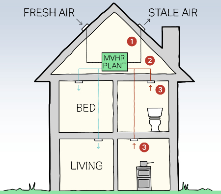 Mechanical ventilation and heat recovery systems (MVHR) combine the various extract fan functions in a home with a small heat exchanger. This takes warmth from the waste air being removed and uses it to heat the incoming air which is replacing it.
