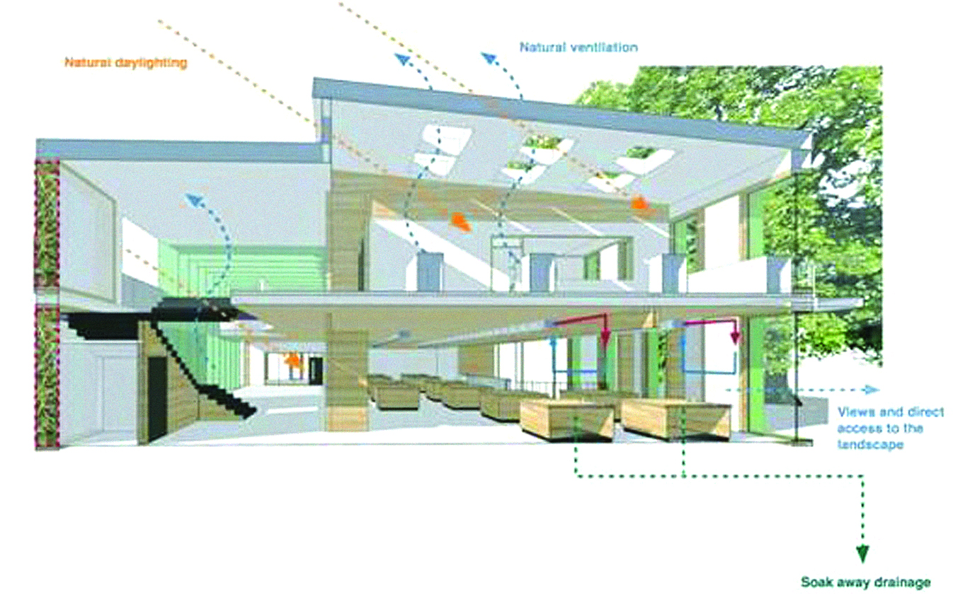 The building uses a mix mode system of mechanical and natural ventilation. All teaching spaces are designed to provide close-controlled natural ventilation, whilst a mechanical ventilation heat recovery system can be used to minimise heat loss in the winter months.