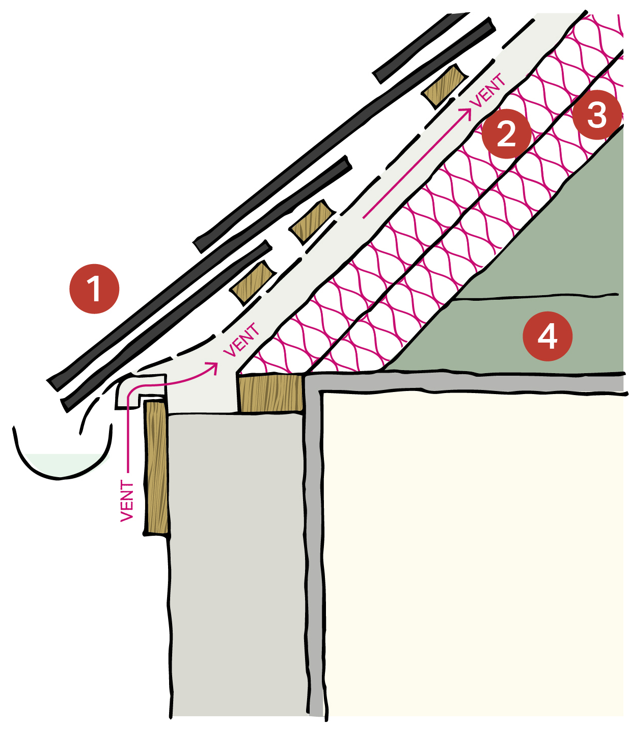 Section drawing of roof insulation at rafter level with the numbers 1 to 4 in various places