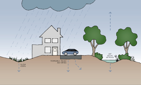 The solution is to introduce permeable surfaces on paths, drives and car parks, so that when it rains, the ground absorbs the water and the sewage system does not become over burdened.