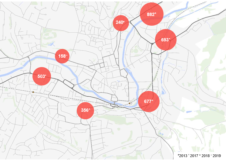 The number of HGVs observed at various locations in Bath (12-hour, two-way counts)