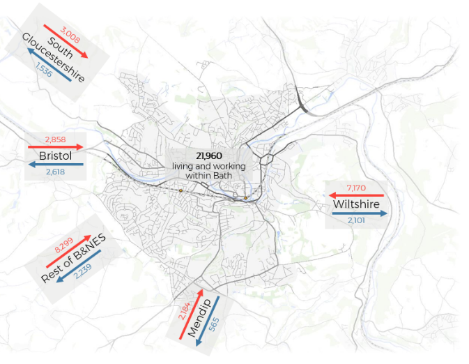 Nearly 22,000 people who live in Bath also work in the city. There are also over 28,000 commuting trips into the city each day from the wider area, with almost 12,000 outbound. The map below shows Bath's top five inbound and outbound commuting flows. The highest demand routes are inbound from the wider B&NES area and Wiltshire.