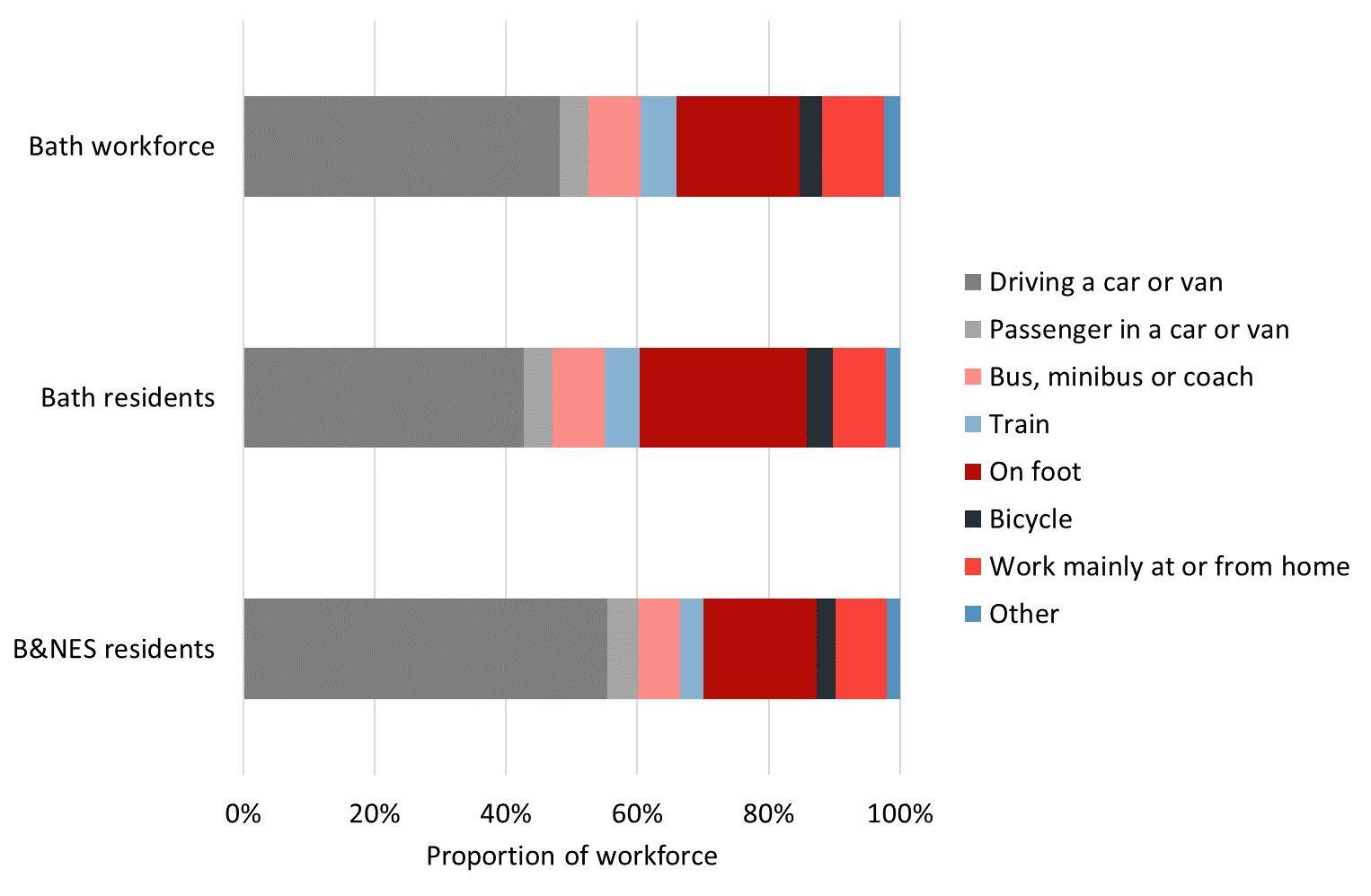 For residents of Bath, 45% of journeys to work use sustainable modes of transport, and 47% travel by car (as driver or passenger), with the remaining 8% of Bath residents work from home. However, when considering people who work in Bath, but could live elsewhere, the proportion of car usage increases to 53%. Car use is highest when considering the wider B&NES area, where 60% of residents commute by car.