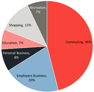 Almost half of weekday travel within Bath is for commuting, with an additional 20% for business travel. Shopping accounts for 12% of travel with the remainder split evenly between education, leisure, and recreational purposes. The dominance of commuting trips is even more marked at peak times, comprising around two thirds of all trips.