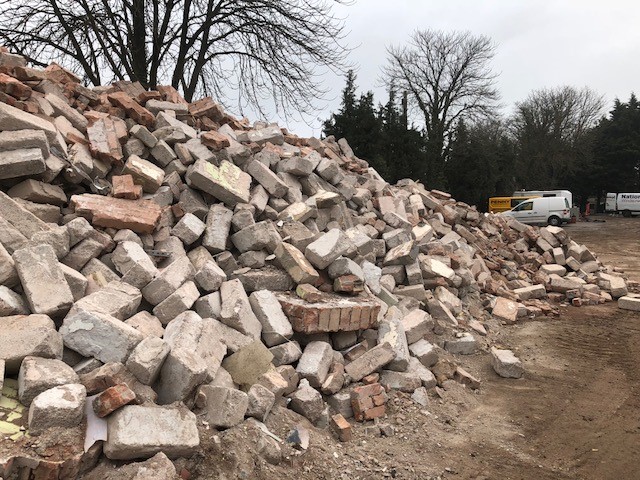 All the brick and stone is being kept on site to be re-used during the construction – that saves journeys by lorry to take it away now, and even more in future because we won’t need to bring hardcore in to the site.