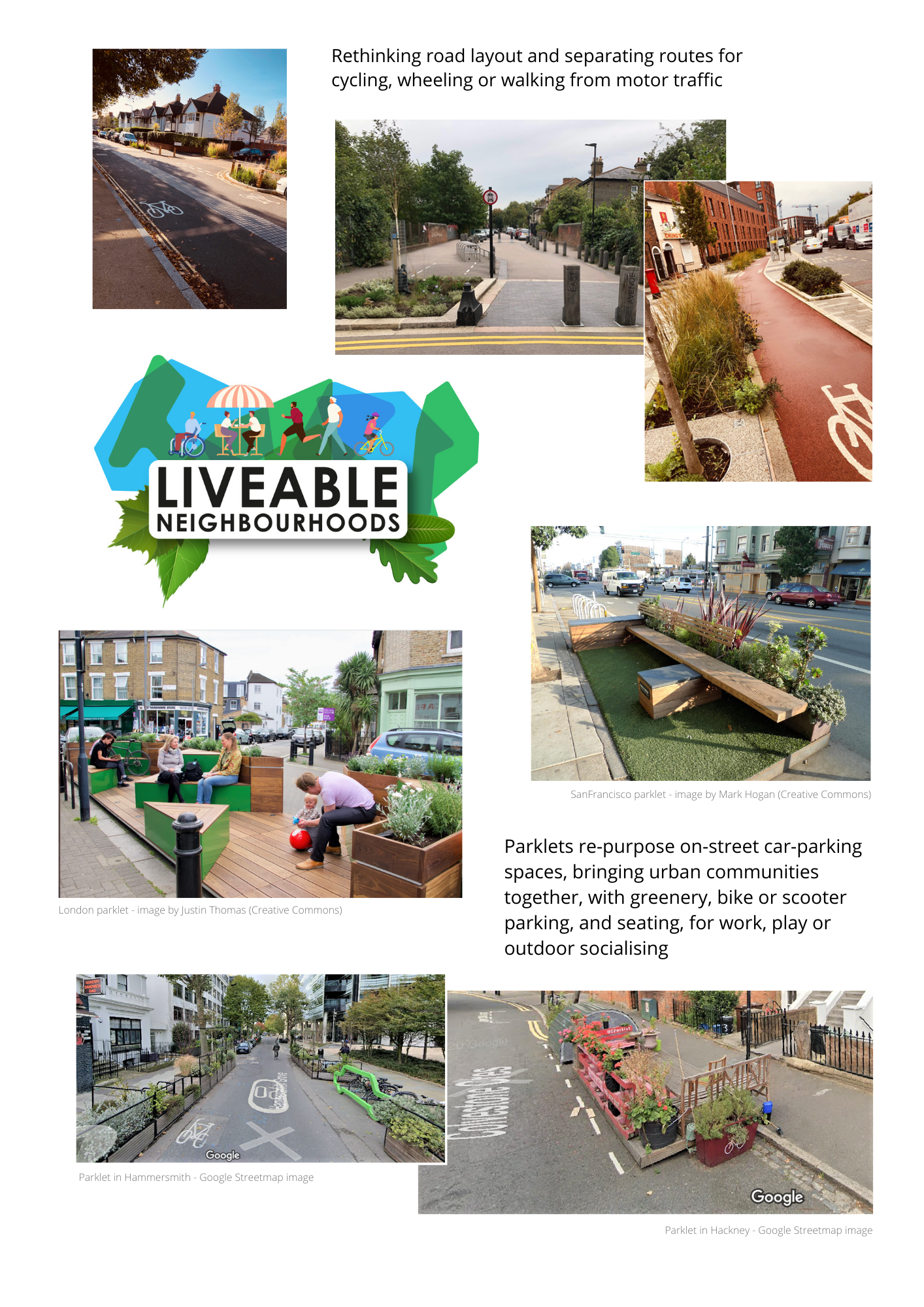 Typical features of a Liveable Neighbourhood include improved routes for walking, wheeling and cycling, traffic restrictions to avoid rat-running and parklets: reclaimed car parking spaces for community use.