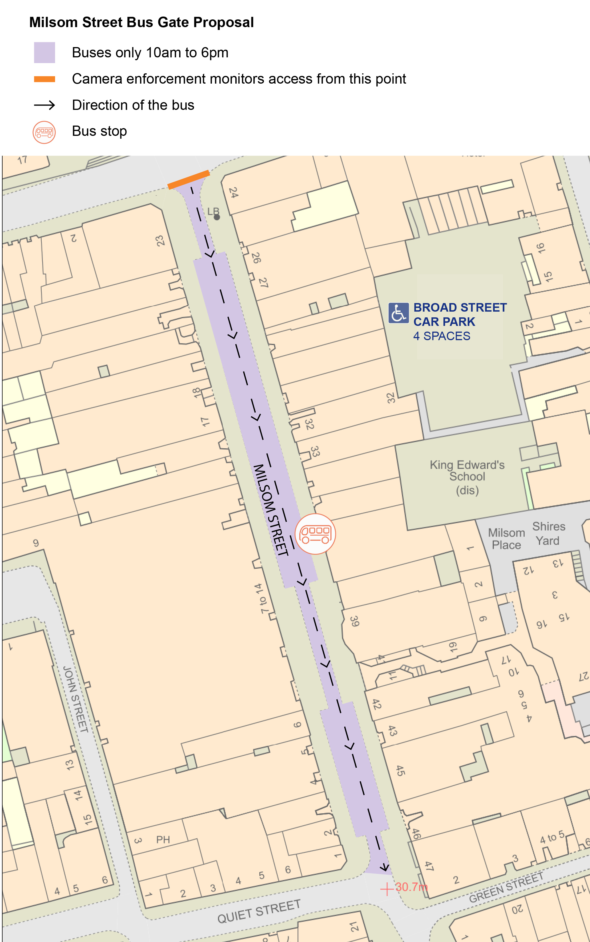 In 2020, we implemented a bus gate on Milsom Street, operating daily between 10am and 6pm, to support public transport and social distancing for pedestrians during the pandemic. We are proposing to implement an Experimental Traffic Regulation Order (ETRO) between 10am and 6pm, to test how the bus gate might work on a permanent basis.