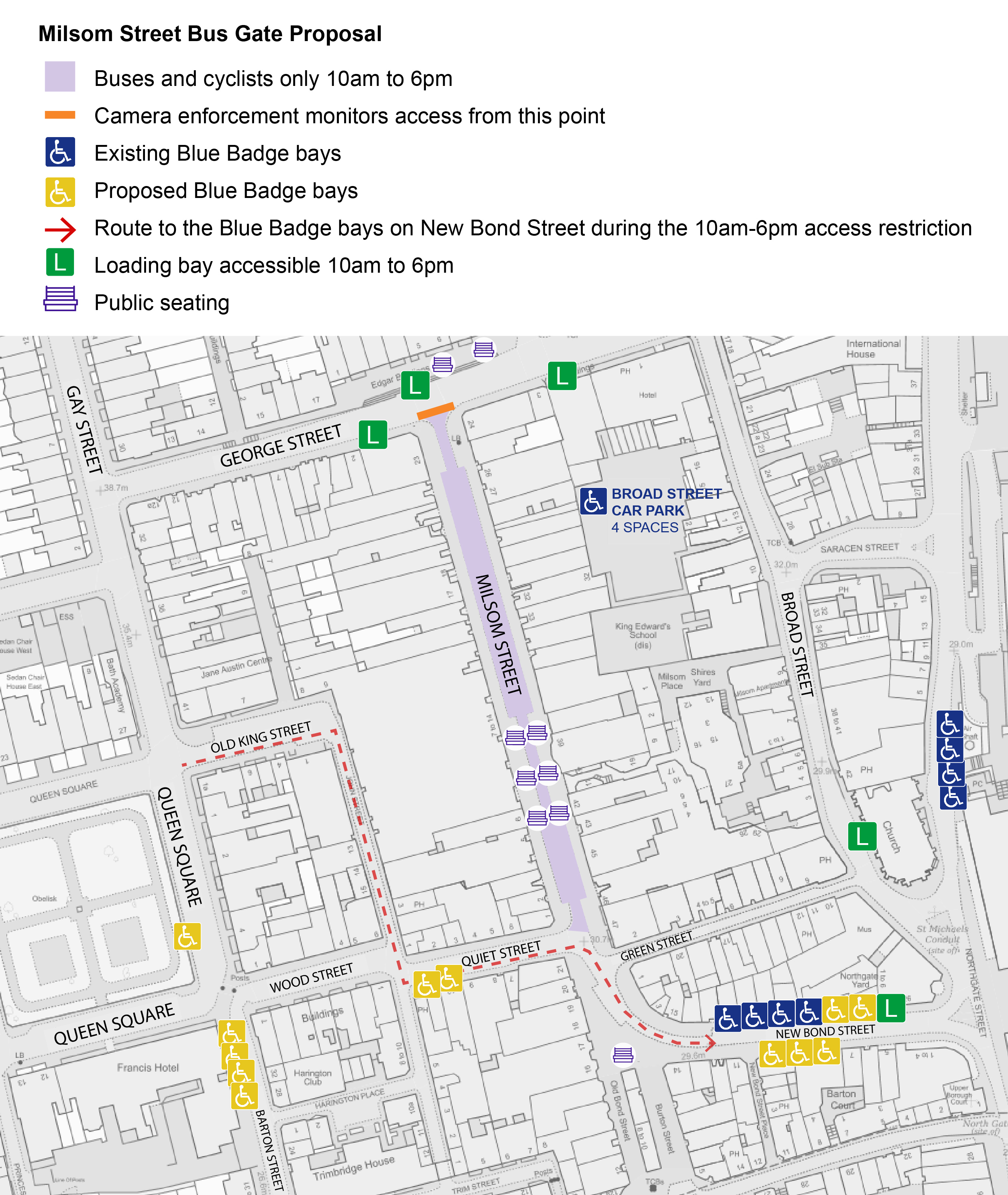 We are proposing a 6-month trial of the Milsom Street bus gate, before deciding whether to make it permanent. See the map below for the area affected by the bus gate.