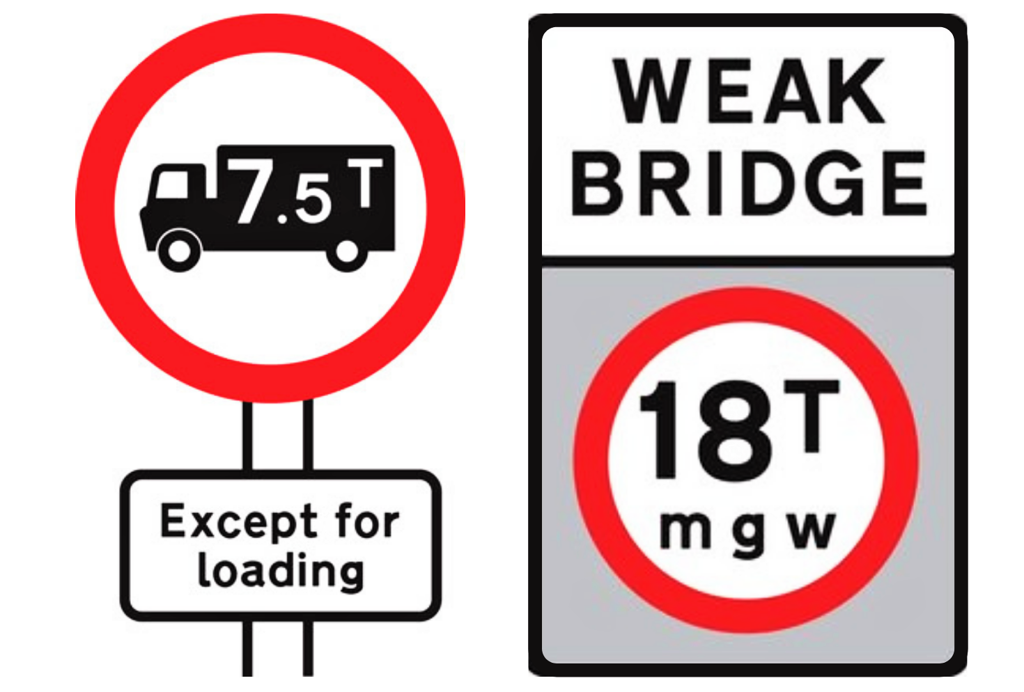 Roads where the weight restriction applies will have clear signage to show the maximum allowed weight, and any exceptions (such as stopping to load goods). Typical examples and their meanings are below.