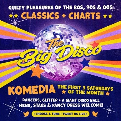 Komedia also hosts, The Big Disco, one enormous party with music from 80s, 90s and 00s on the first three Saturdays of each month. Each week there will be a pro photographer, confetti canons, photo booth, unbeatable drinks deals and great tunes!