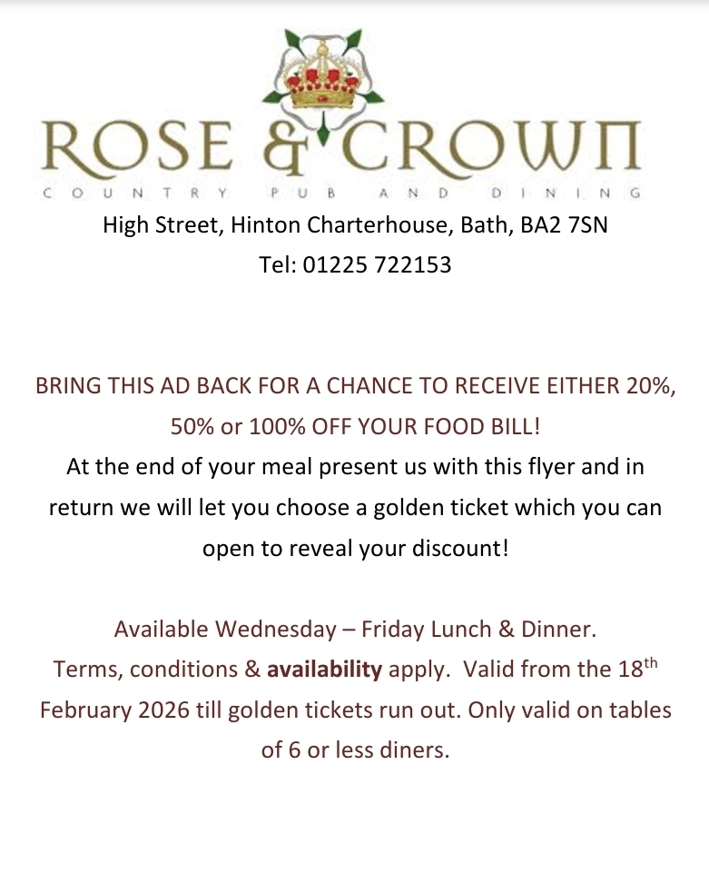 A two-course dinner for £25 per person and then only £20 per person to stay overnight in our cosy rooms. Contact the Rose & Crown directly on 01225 722 153 or by email at apuntaralto@hotmail.com for availability, current offers and preferential rates for Discovery Card holders.